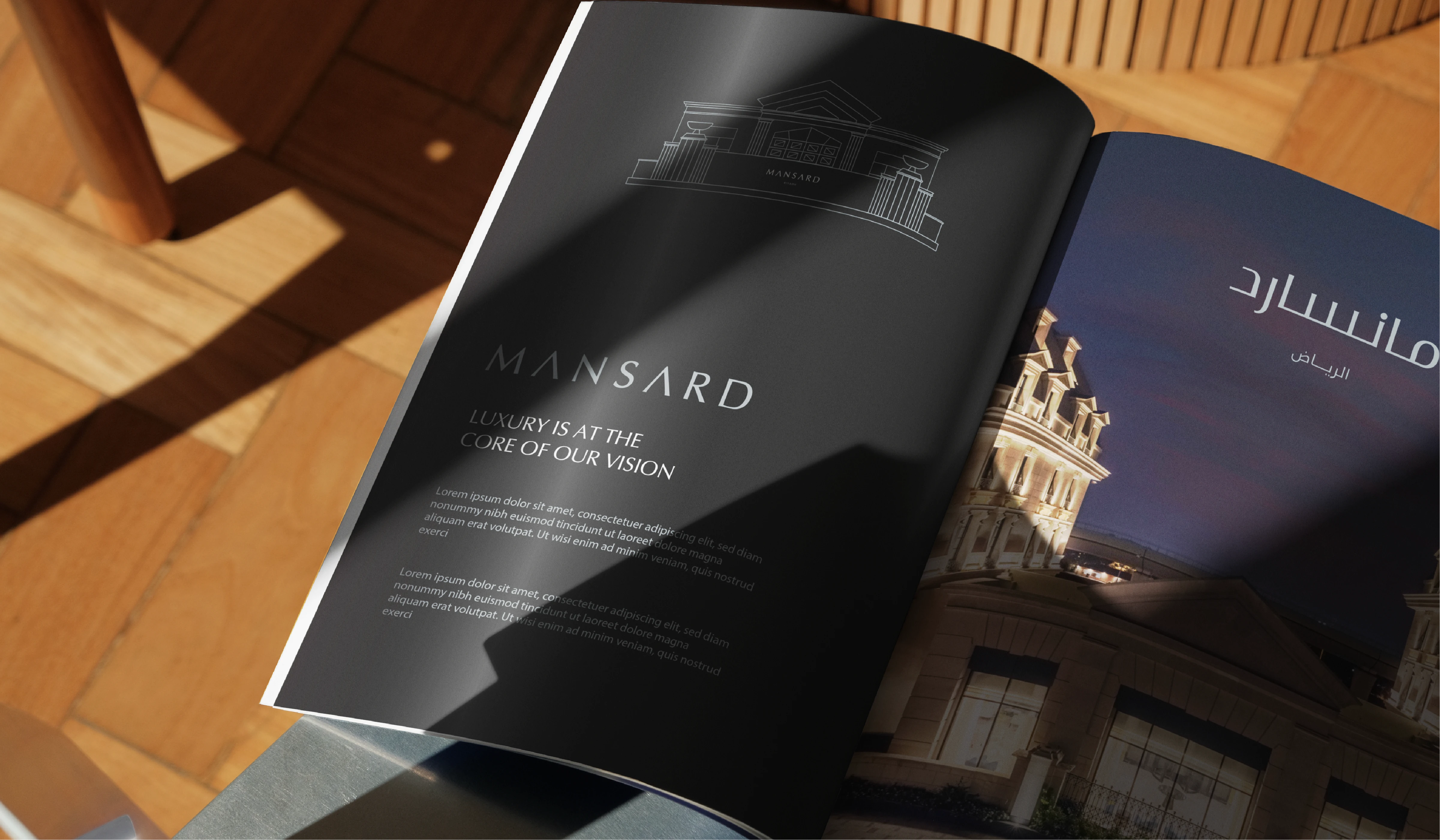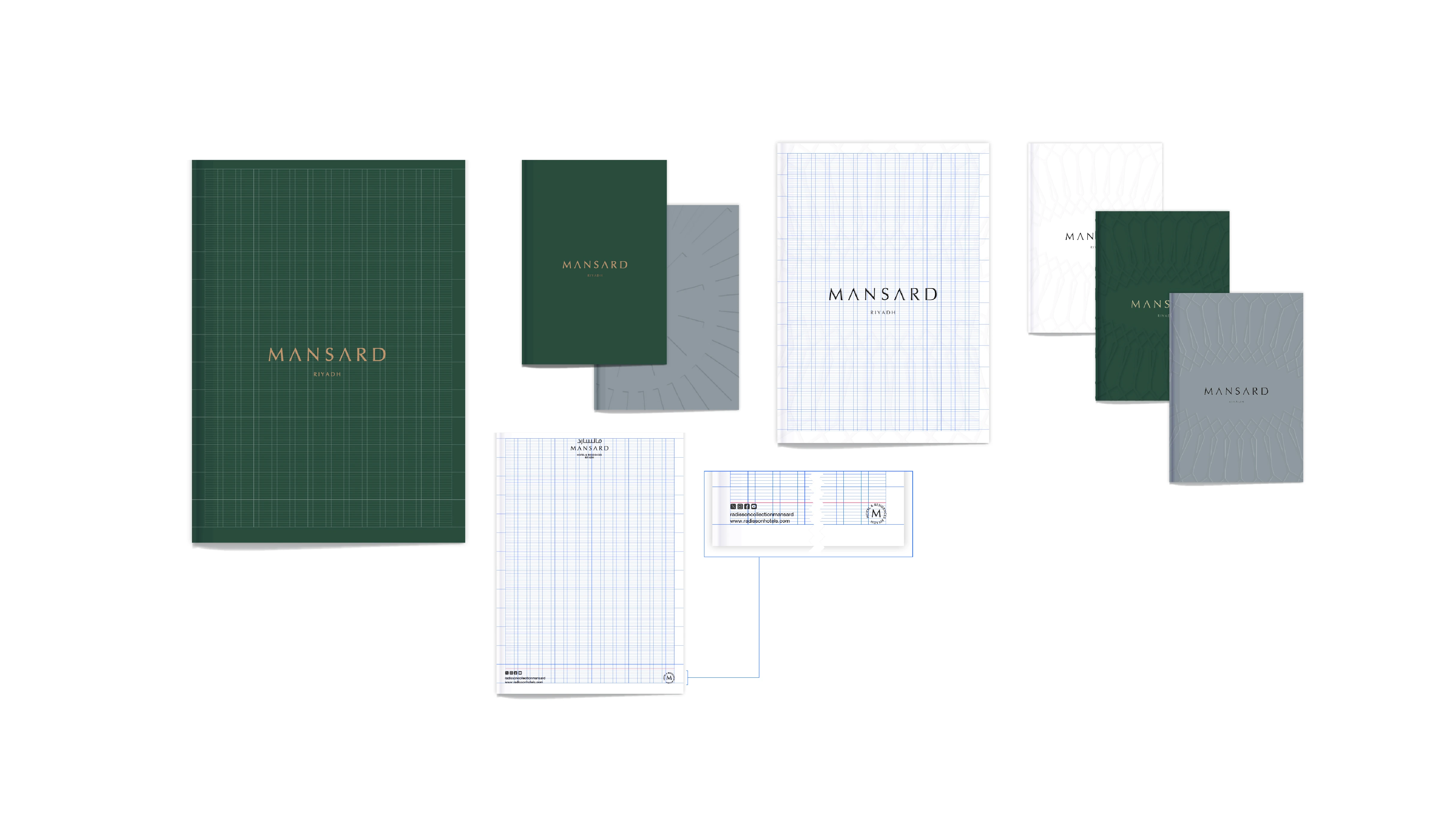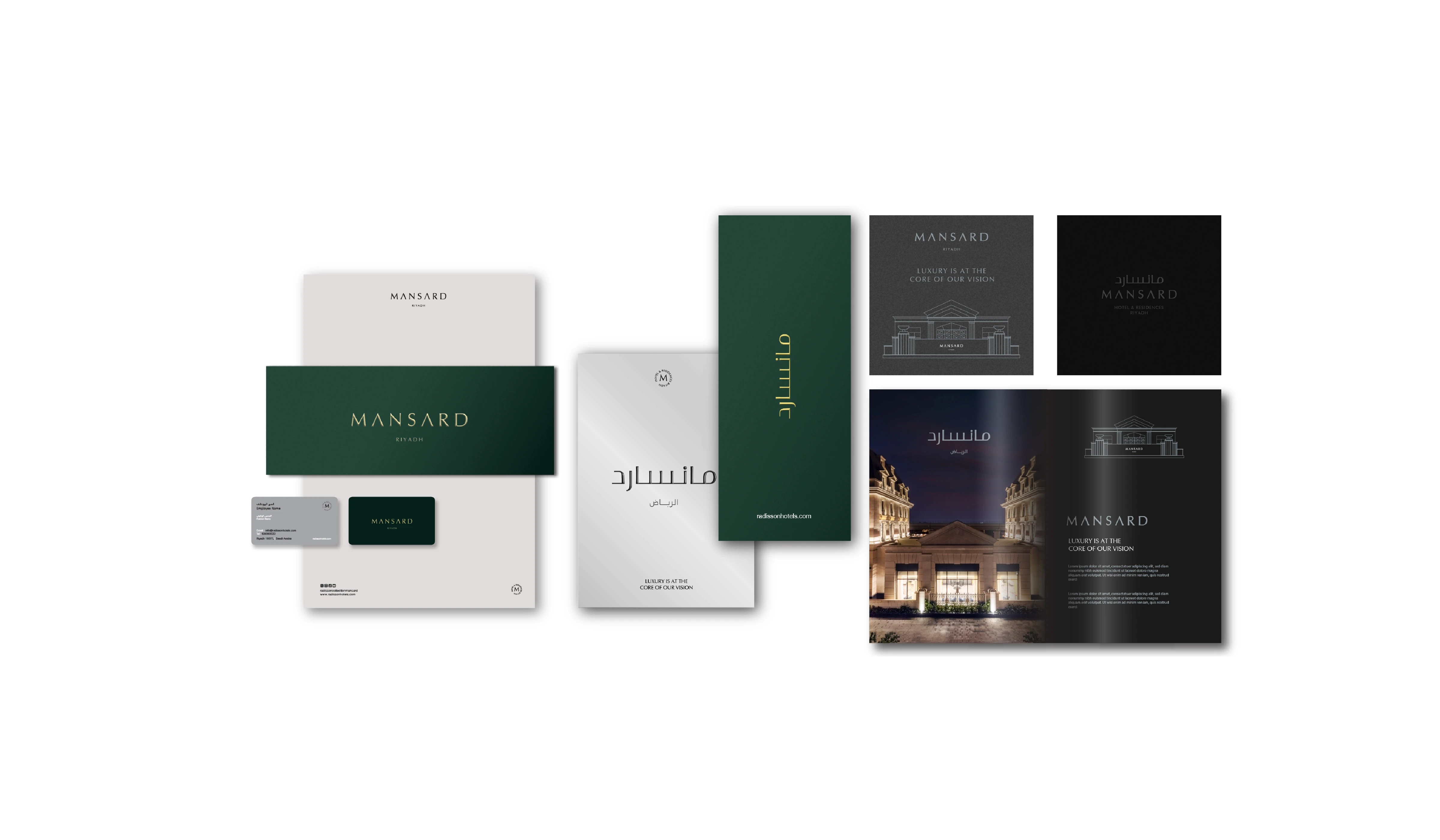 Mansard Riyadh is a luxury hotel and residential destination that blends European architectural elegance with modern Saudi sophistication. Our role in this project was to develop a complete brand identity that reflects the property’s premium positioning while capturing its timeless character and refined atmosphere. The objective was to create a visual system that communicates exclusivity, architectural beauty, and elevated hospitality. The identity draws inspiration from classical forms, symmetry, and the distinctive mansard roof silhouette, translating architectural heritage into a contemporary visual language. A rich deep green was selected as the primary brand color to evoke prestige, tranquility, and permanence, while metallic gold accents express luxury, craftsmanship, and attention to detail. Elegant typography with generous spacing reinforces a sense of refinement and confidence. The visual system extends seamlessly across stationery, digital applications, uniforms, and environmental signage, ensuring a cohesive and sophisticated brand experience throughout every guest touchpoint.